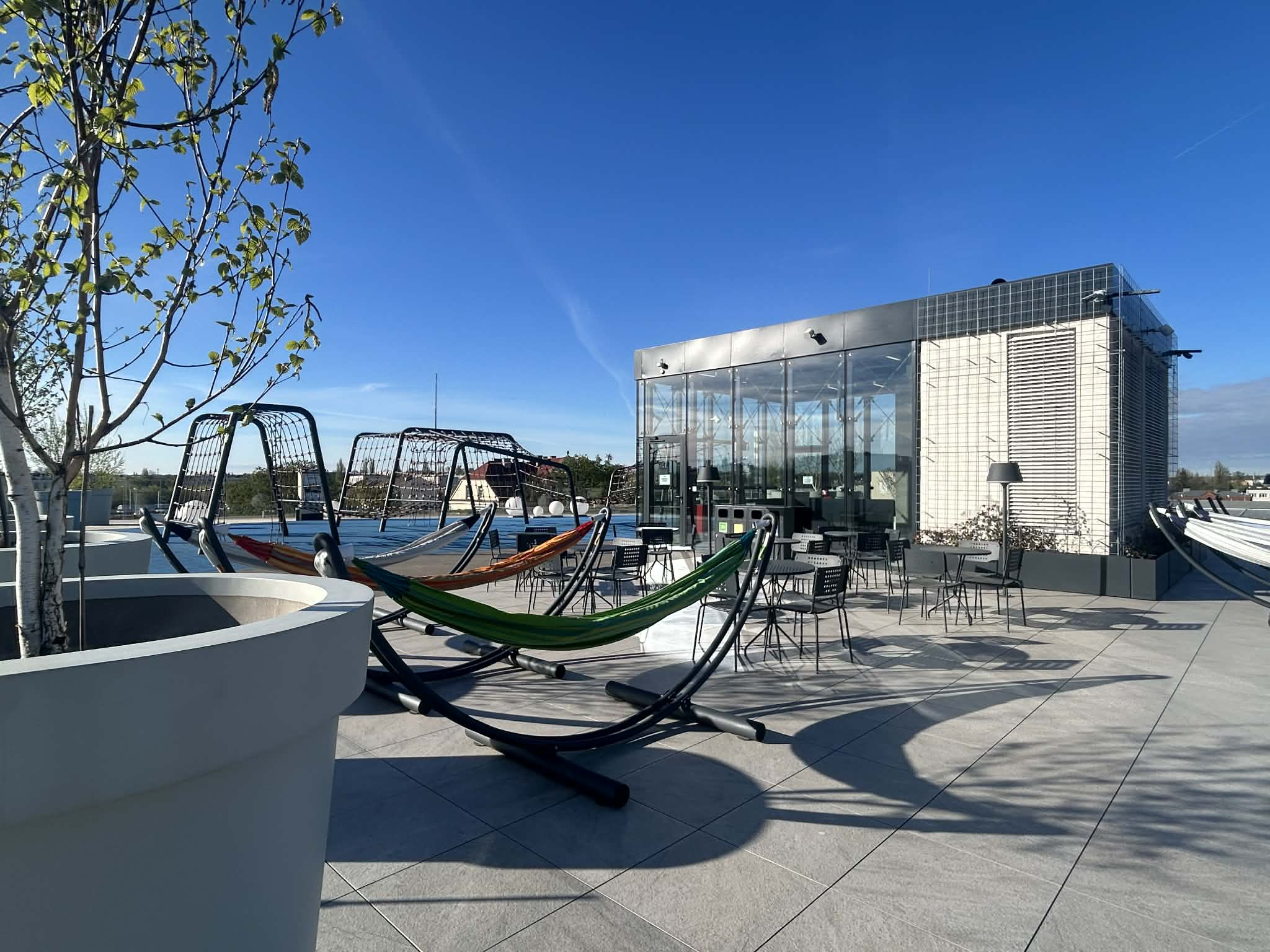 Znajdziesz tu kolorowe hamaki, które zachęcają do relaksu. Możesz się położyć, zamknąć oczy i na chwilę zapomnieć o obowiązkach. Dla rodzin przygotowano mały plac zabaw, więc dzieci też nie będą się nudzić.